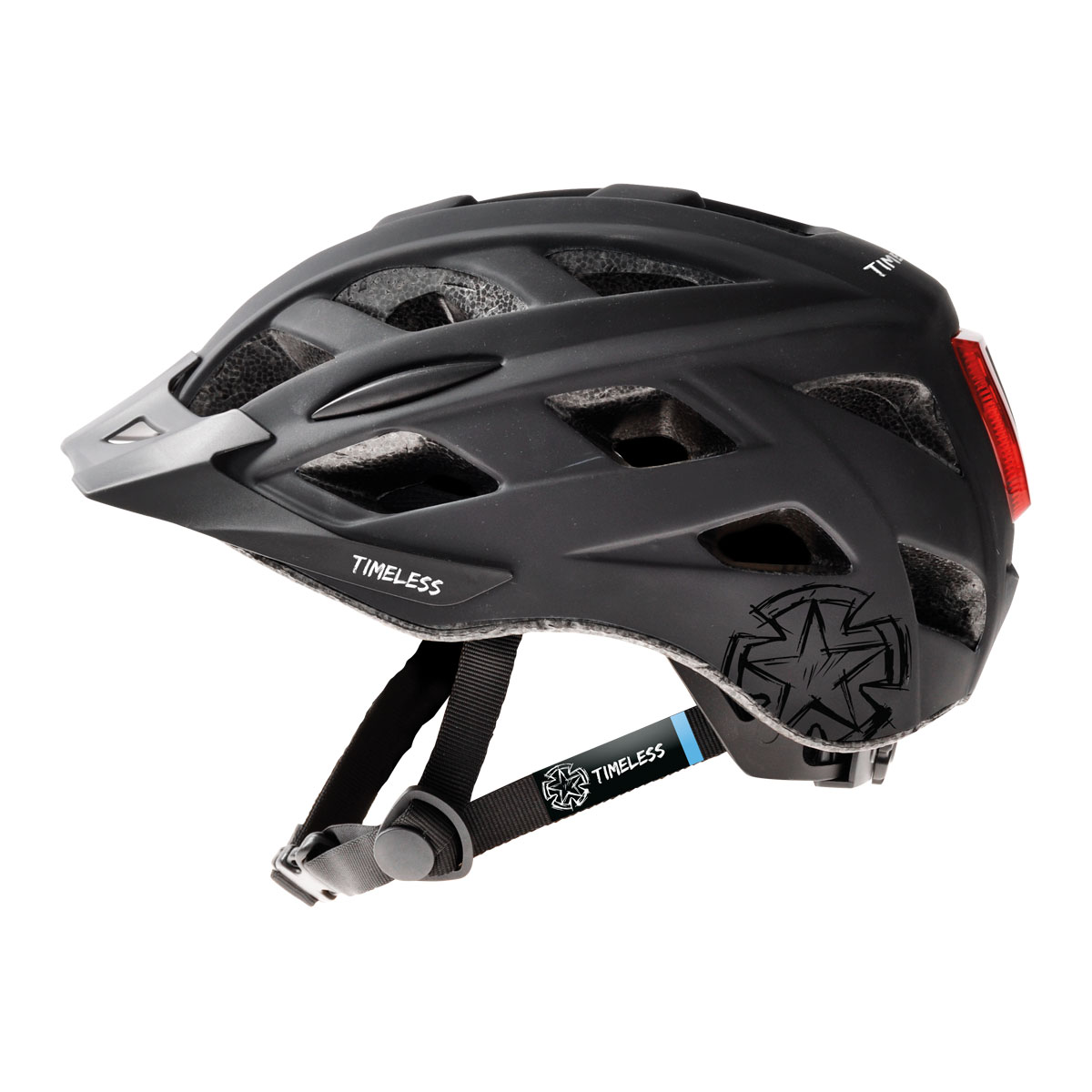 Kevyt Timeless-kypärä kadulle tai maastoon!- Rakenne: glue-on (liimattu PVC-kuori)- Säätö: kierrettävä säätöpanta takana- Integroitu takavalo, 3-toimintoa (6-lediä) (päällä, vilkku ja nopea vilkku)- Tuuletusaukkoja: 19- Integroitu lippa- CE-hyväksytty- Koot: M/54-59, L/58-61- Paino: 280g (M-koko)