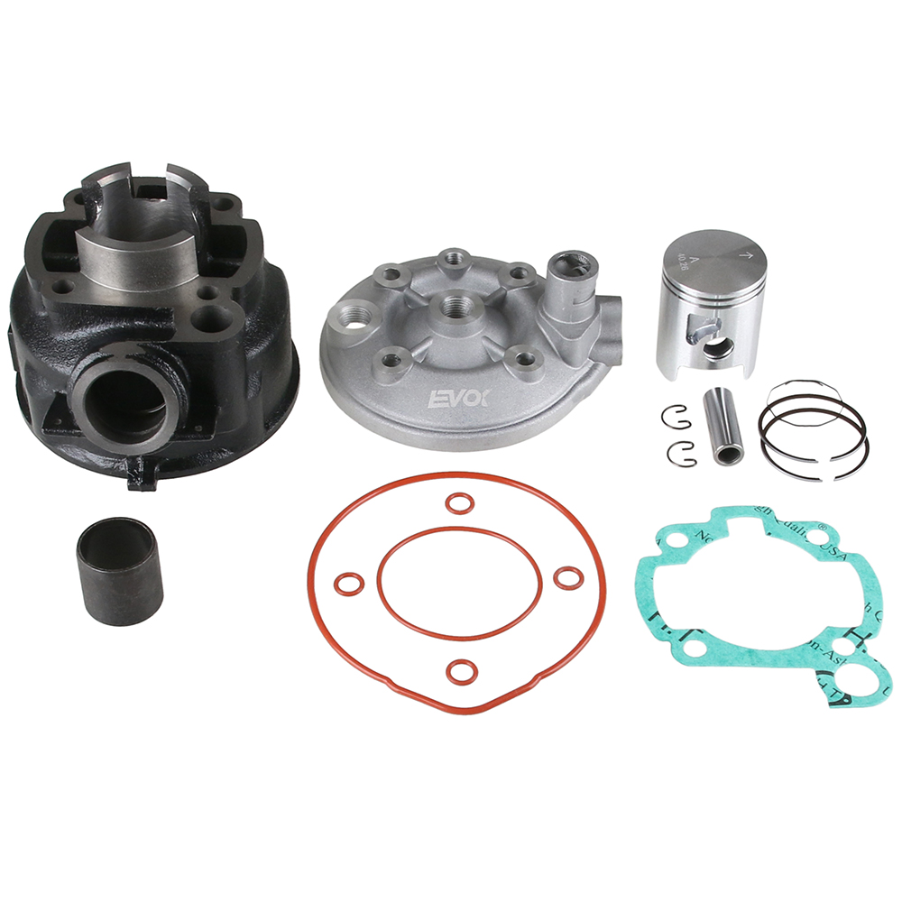50cc sylinterisarja Minarelli AM6 moottoriin. Sarja sisältää valurautaisen sylinterin, sylinterikannen, mäntäsarjan, tiivisteet sekä pakoputken holkin.